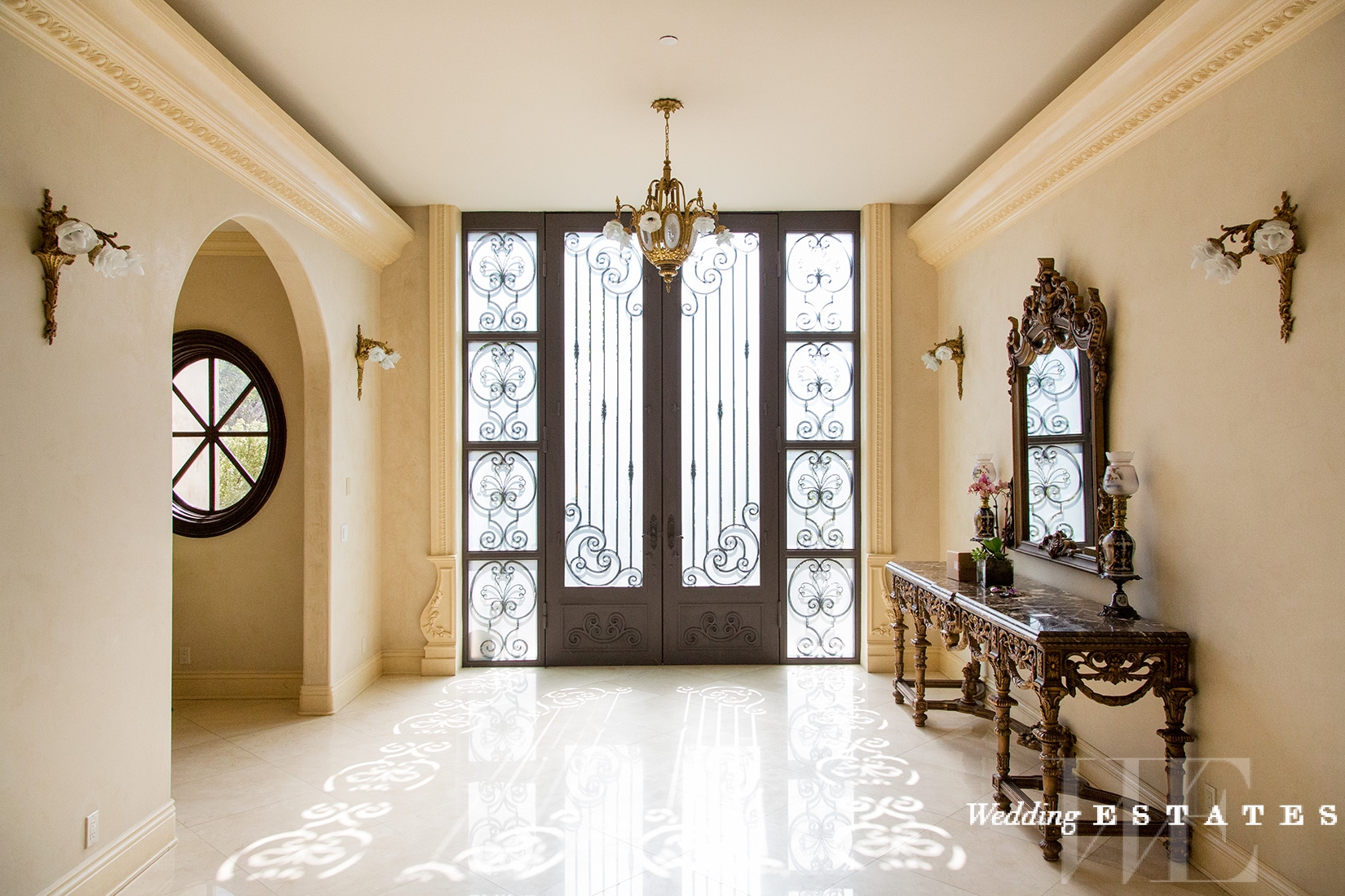 Set into the hills of Bel Air, the Tiffany Estate features gorgeous grounds with an unbelievable view of wilderness and water. Within, discover a foyer fit for a prince or princess. A double grand staircase with wrought iron railings winds upwards, with an ornate chandelier above. Above all, this foyer is a gorgeous space to photograph the entire wedding party.